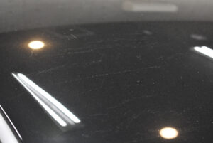 高輝度LED照明の下、状態の確認をしてみたところ、ルーフに保護シートの剥がし跡やイオンデポジットなどが見受けられました。