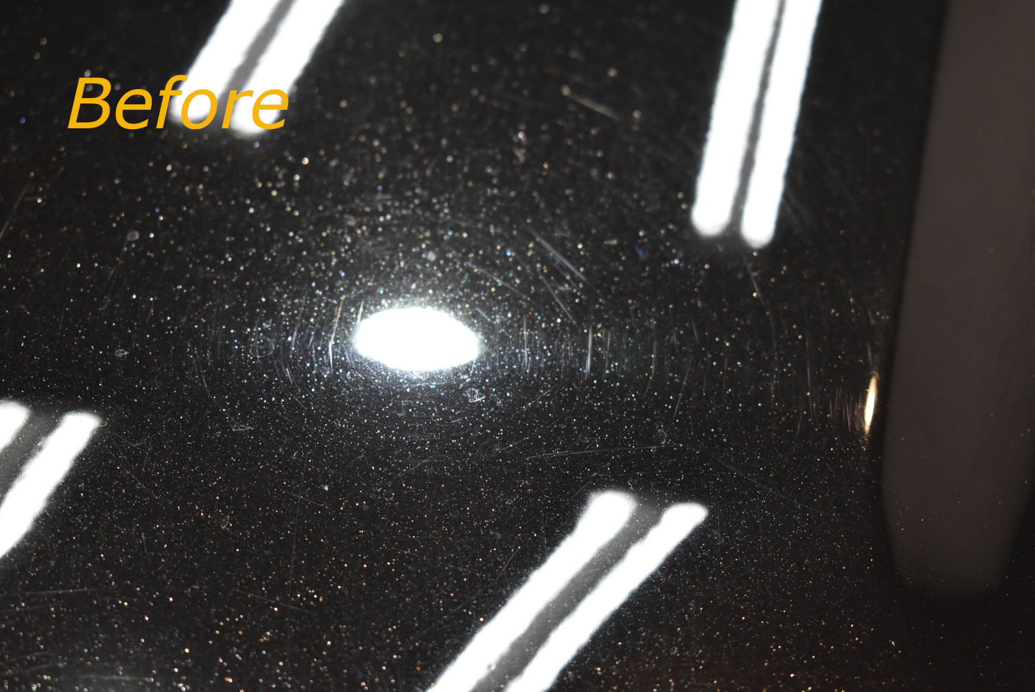 高輝度LED照明の下、状態を確認してみますと全体的に洗車キズや、イオンデポジット、水垢などが見受けられました。
