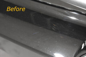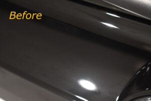 高輝度LED照明の下、状態確認をしてみますと、黒色のパーツに洗車傷、イオンデポジットなどが見受けられました。