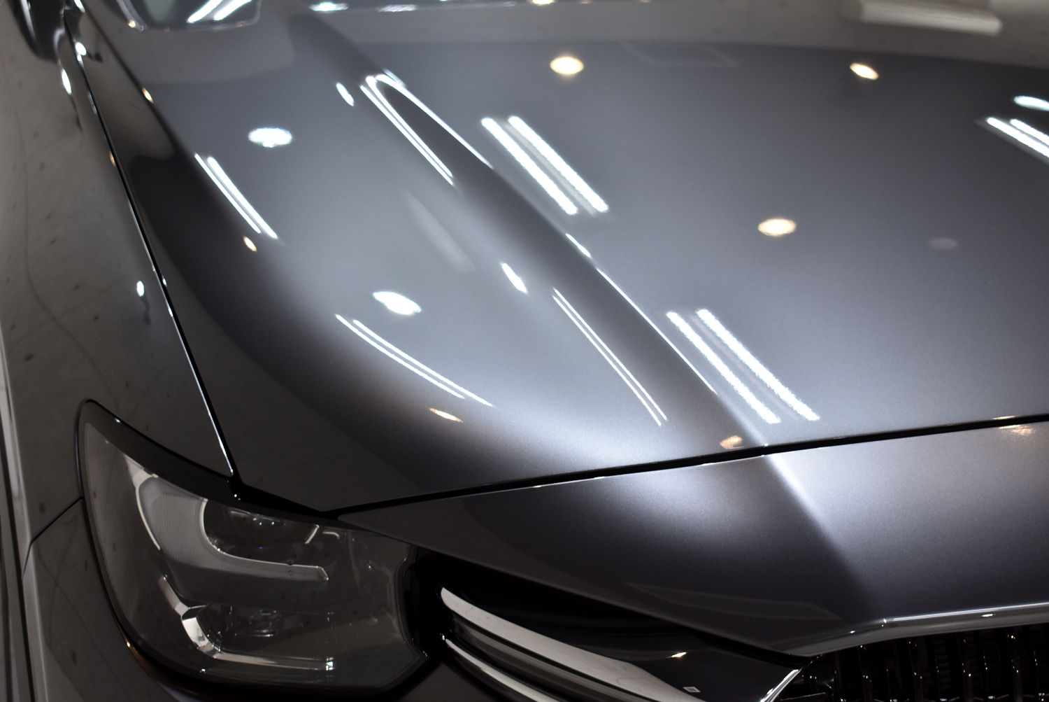 高輝度LED照明の下、状態確認をしてみますと、窓ガラス、ボンネット、ルーフの一部にシミ汚れが見受けられました。